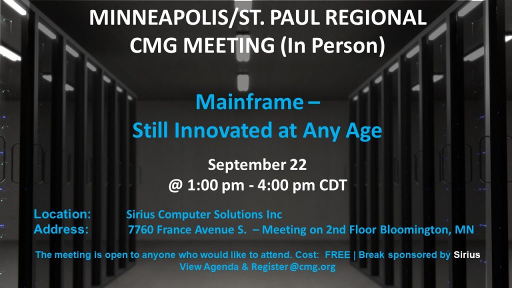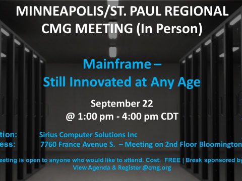 September 6, 2022Minneapolis/St. Paul Regional CMG Meeting Mainframe – Still Innovated at Any AgeDate: Thursday September 22, 2022 Time: 1:00 PM – 4:00 PM Location: Sirius Computer Solutions […]